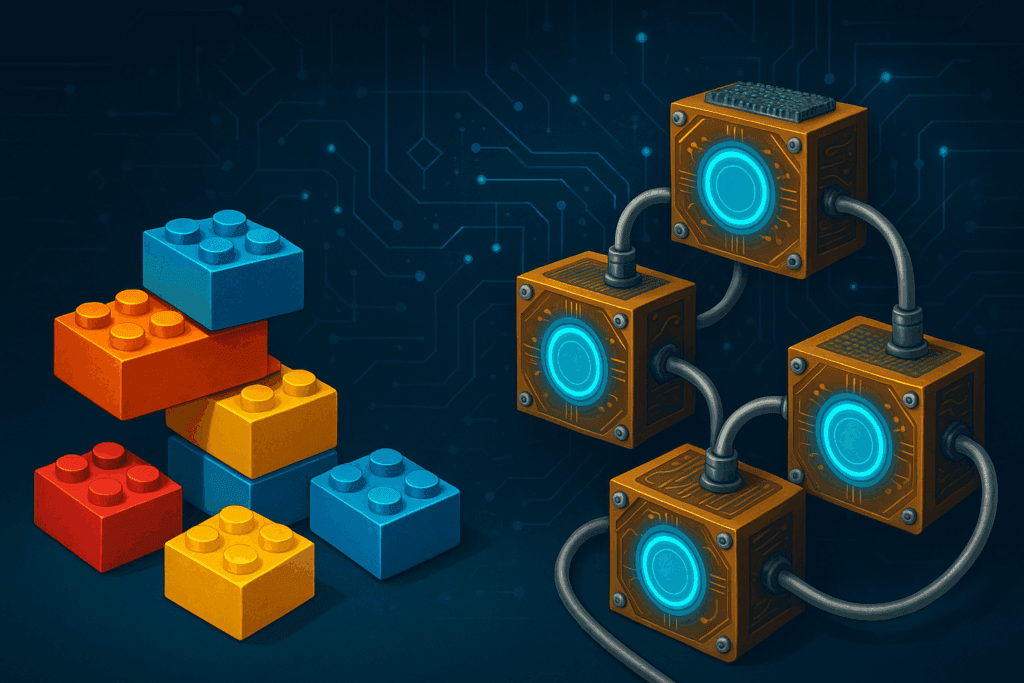 小規模ユニットを組み合わせて大規模システムを構築する方式。拡張性と再構成性を兼ね備えている。